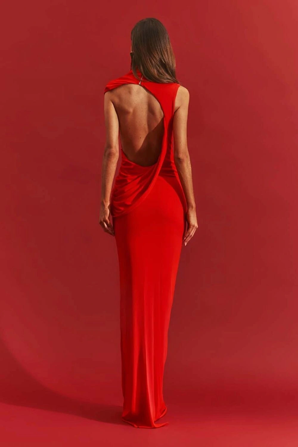 Vestido longo ajustado ao corpo Gola alta e costas abertas com drapeado fluido Tecido de malha estruturada com toque acetinado Caimento elegante e confortável Comprimento até o chão