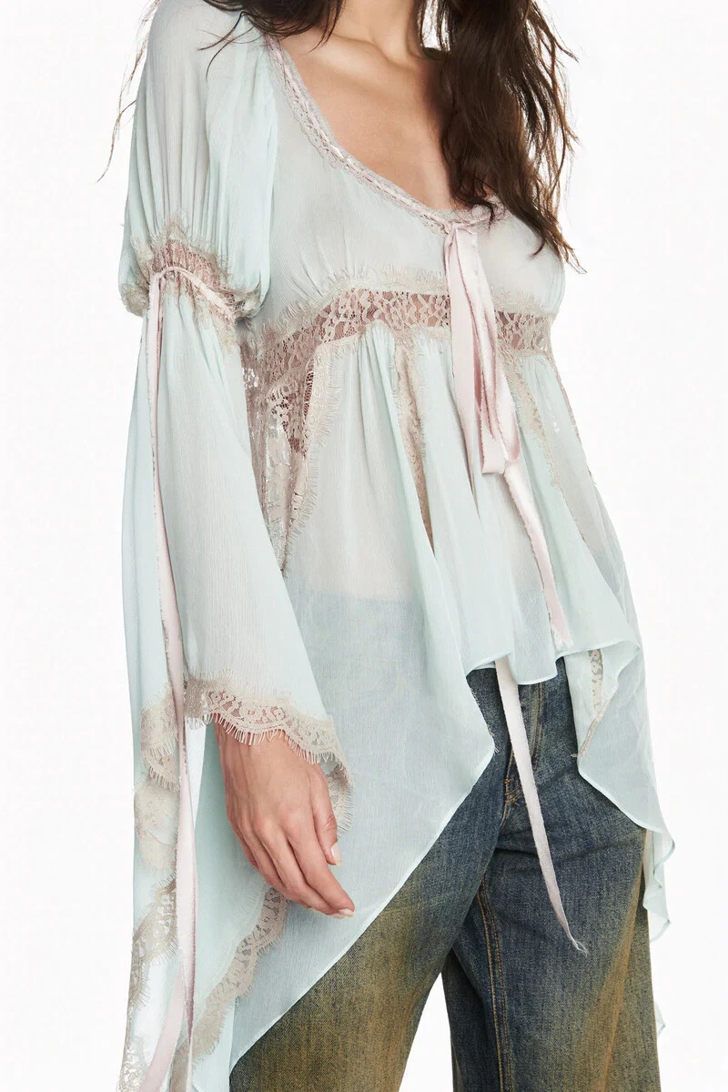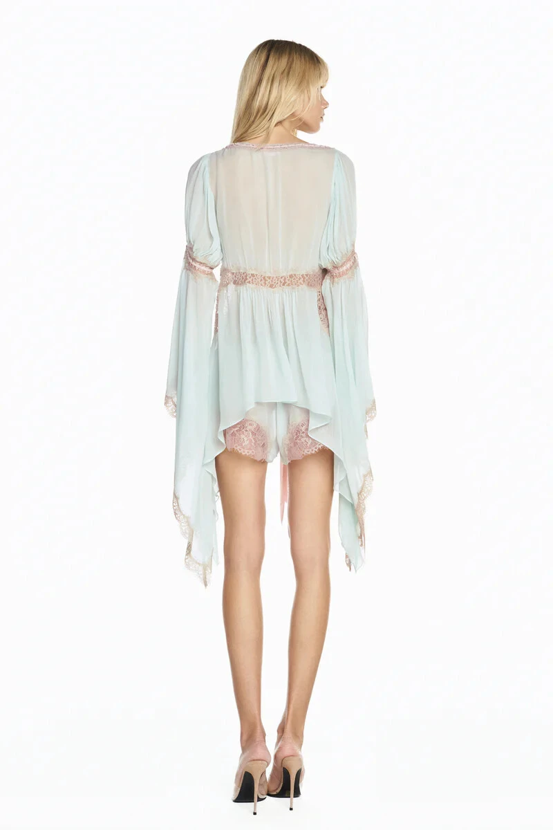 Bata em chiffon delicado, com leve transparência e modelagem fluida. Possui decote arredondado e passa-fita com tira a fio em cetim tingido, aplicado manualmente no decote e nas mangas. Detalhe de aplicações de rendas manualmente tingidas e vazadas por toda a peça e acabamento com pontas assimétricas. Não possui fechamento.