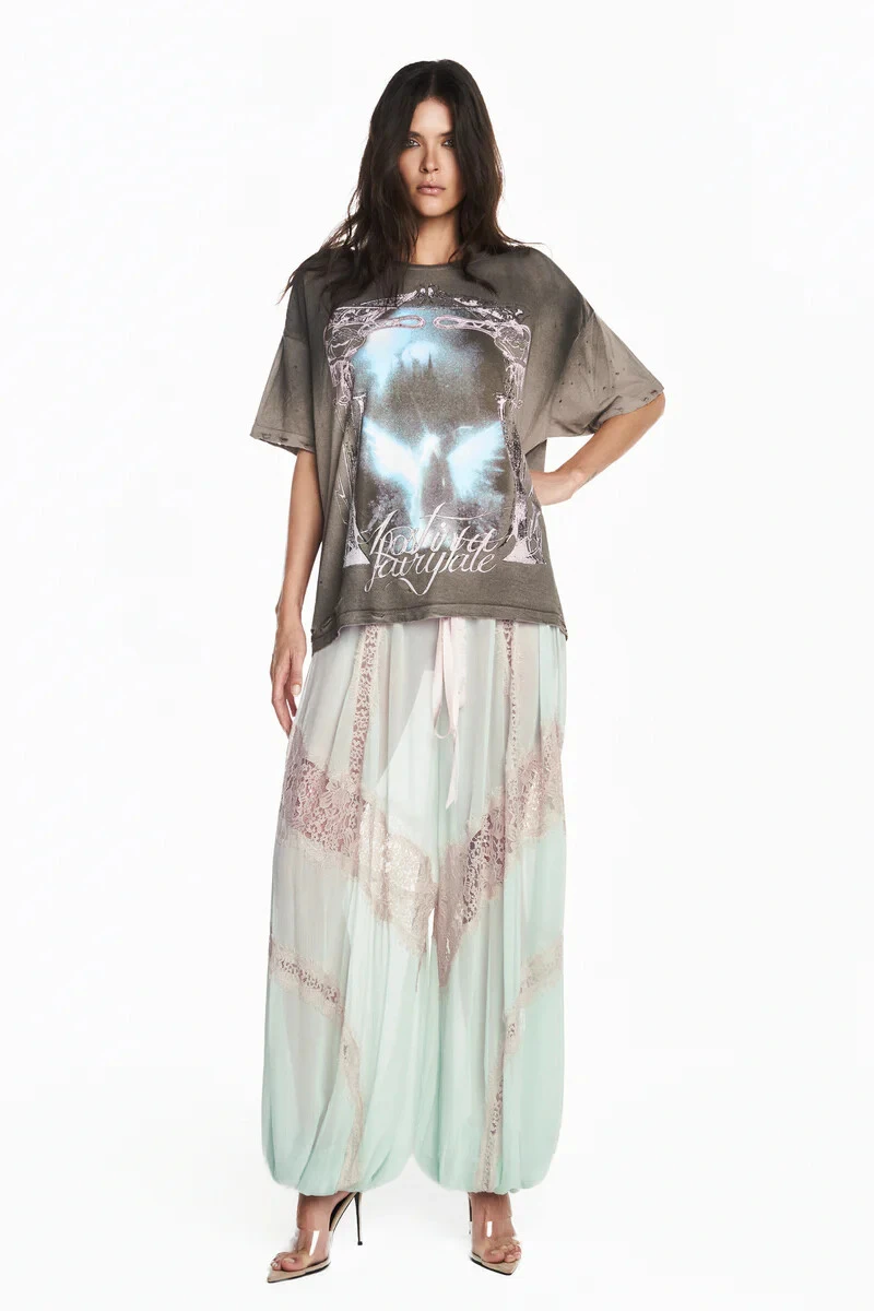 Camiseta em algodão com modelagem ampla e estampa localizada na parte frontal e posterior. Possui aplicação de pedrarias, hotfix e efeito destroyed por toda a peça, com decote redondo e mangas curtas. Não possui fechamento. Produto com adesivos exclusivos e personalizados em quantidade limitada.