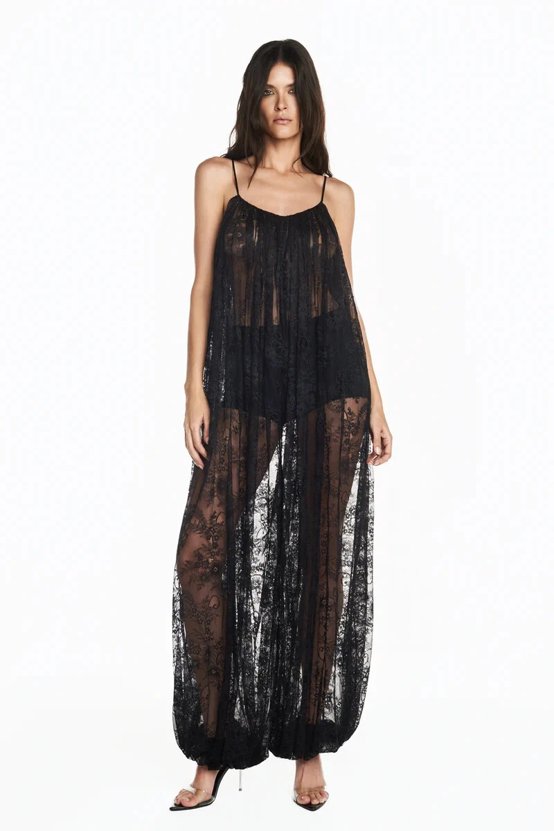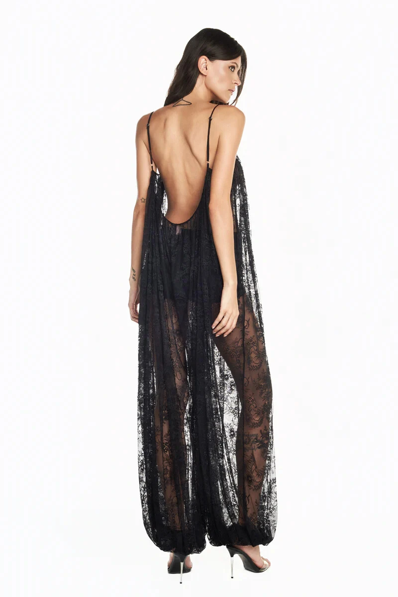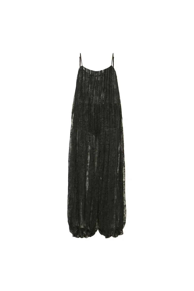 Macacão em renda com transparência e caimento fluido. Possui modelagem reta com shape soltinho, decote arredondado franzido com decote das costas cavadas e alças finas com regulador para melhor ajuste ao corpo. Elástico embutido no acabamento da barra com franzido remetendo ao estilo Aladim. Não possui fechamento.
